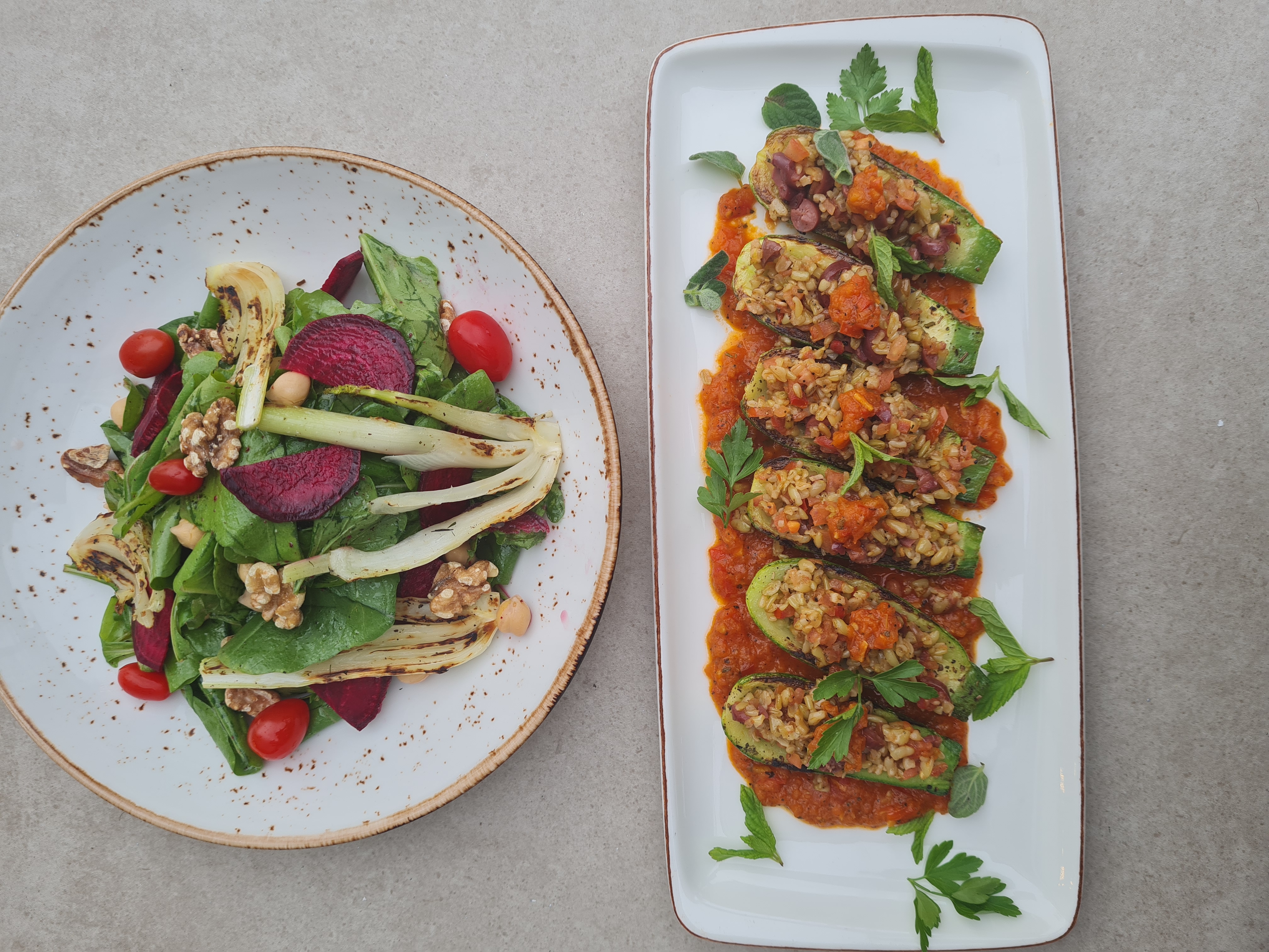 Celebrating World Vegan Day is an annual event celebrated by vegans around the world every 1 November. The benefits of veganism for humans and the natural environment are celebrated through activities such as setting up stalls, hosting potlucks, and planting memorial trees. At Wild Jordan Center, a set meal was created and enjoyed! The menu included a Fennel Rocca Salad and Freekeh Stuffed Zucchini for only 9JD ++